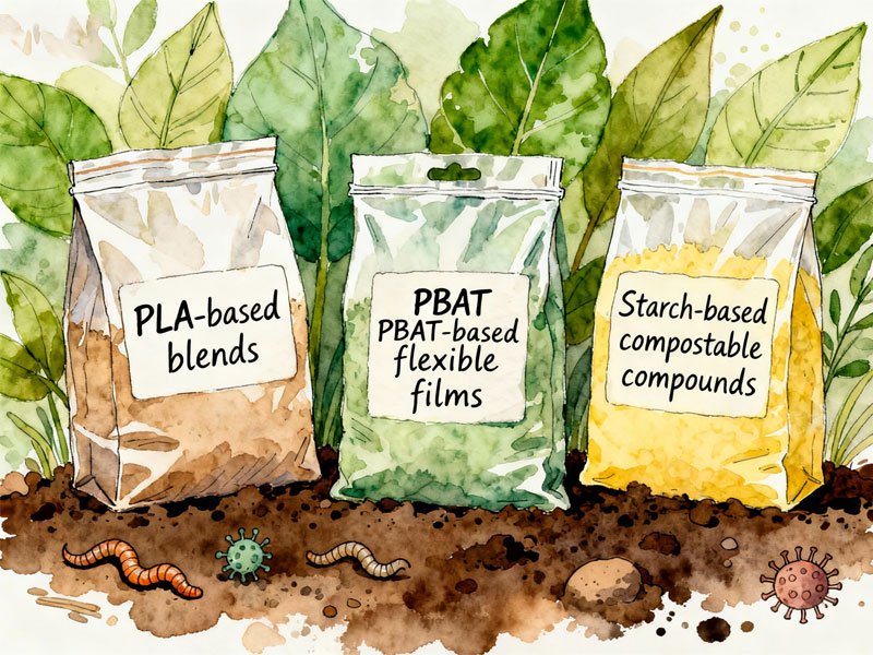 - Made from certified compostable plastics like PLA, PBAT, and starch blends.
